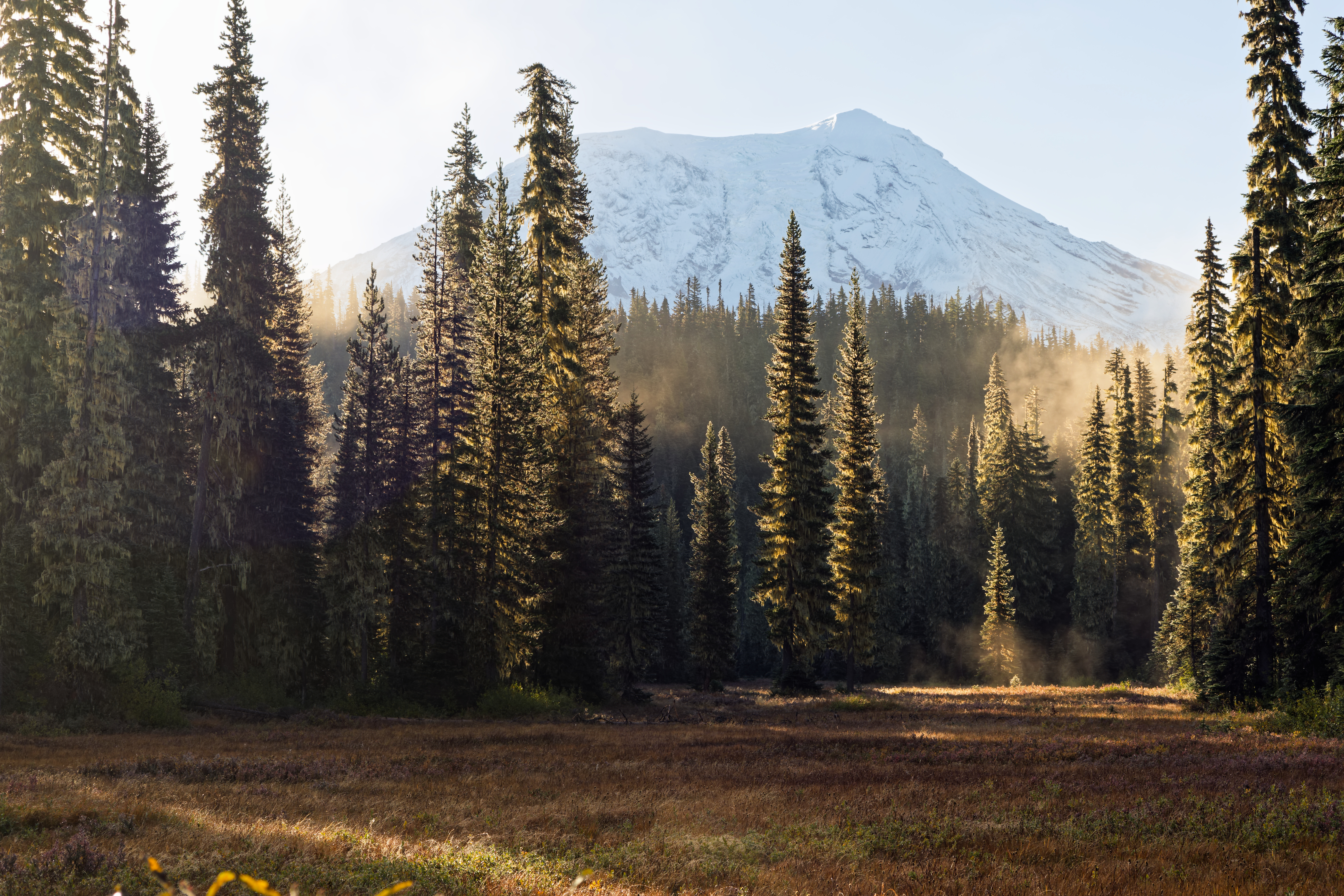 Above: Adams, a meadow and fog in warm early morning sunlight.