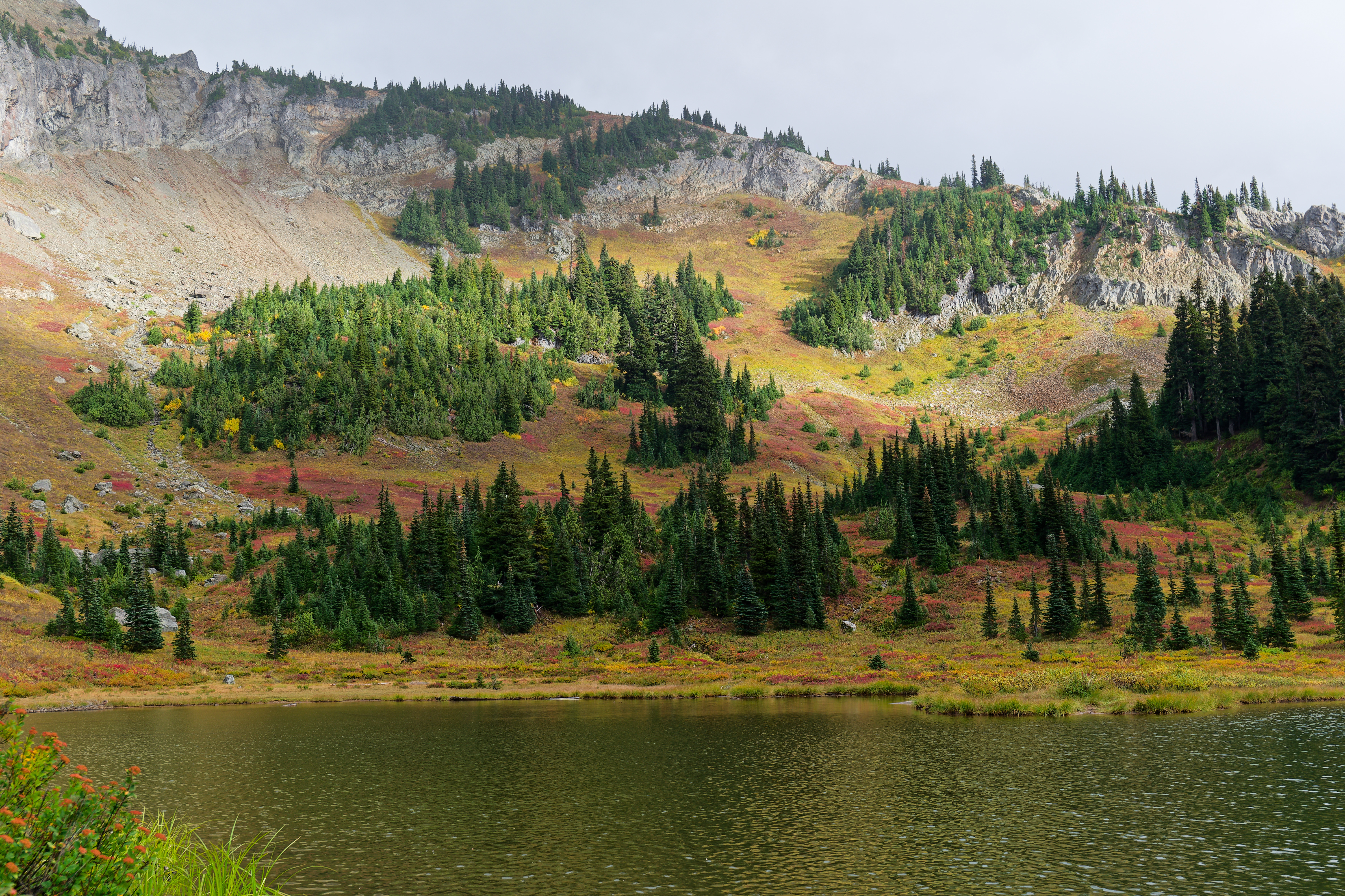 Above: Rainier from Naches. Above: Rainier above the tarn on Naches. Above: Intense Fall color along parts of the trail. Above: Fall color and some remaining wildfire smoke out to the east. Above: Tarns on the east side of the loop. Above: Final mid morning view of Tipsoo and Rainier.