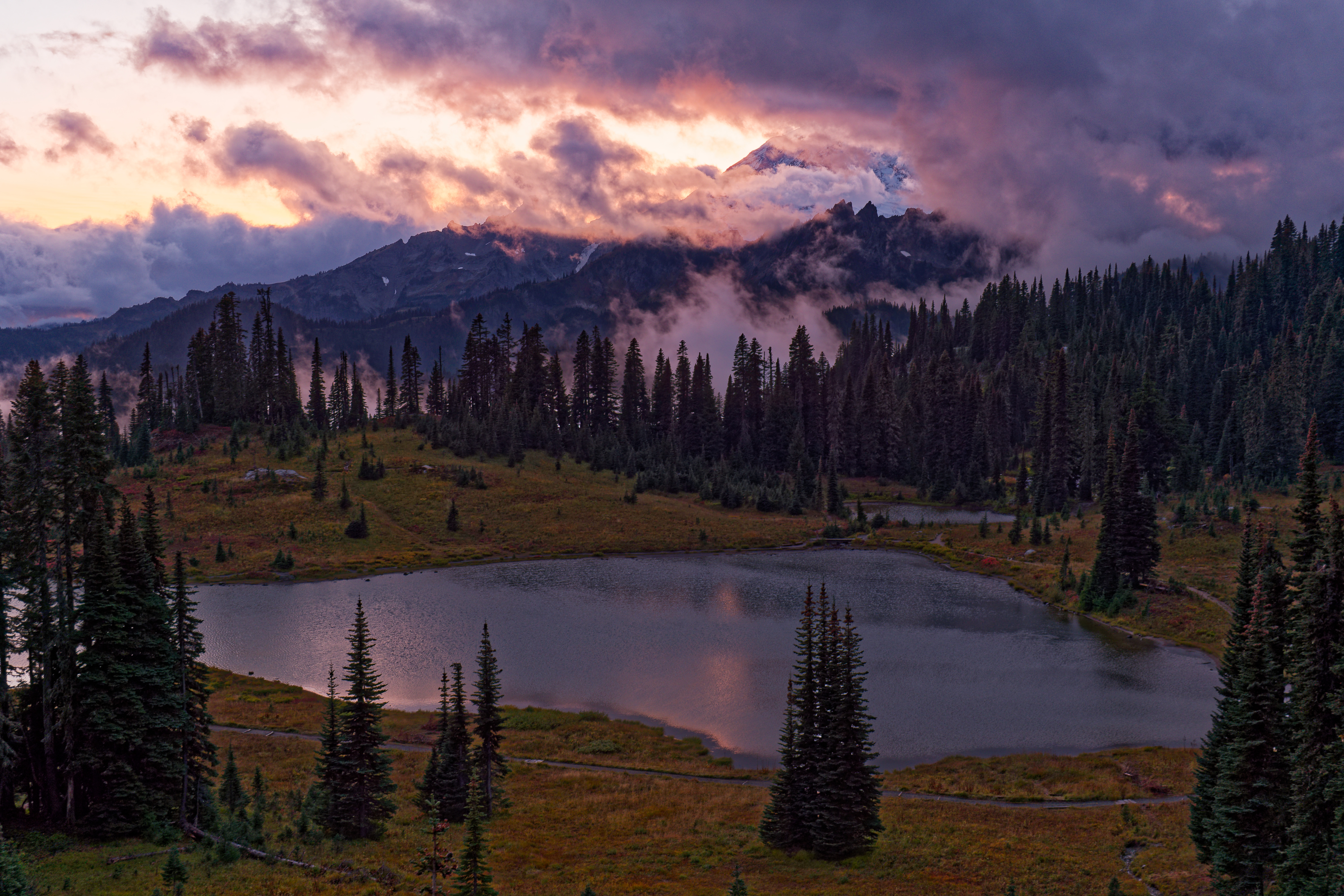 I was convinced the low pressure bringing all the rain would finally move out based on the clearing I began seeing at sunset, so I planned to be at Tipsoo again for sunrise. MY original plan was to hike up Pinnacle Peak this morning but I had not hiked Naches ever and figured I could get a great sunrise at Tipsoo then immediatley knock out Naches and be home at a reasonable time. Sunrise didn’t disappoint!