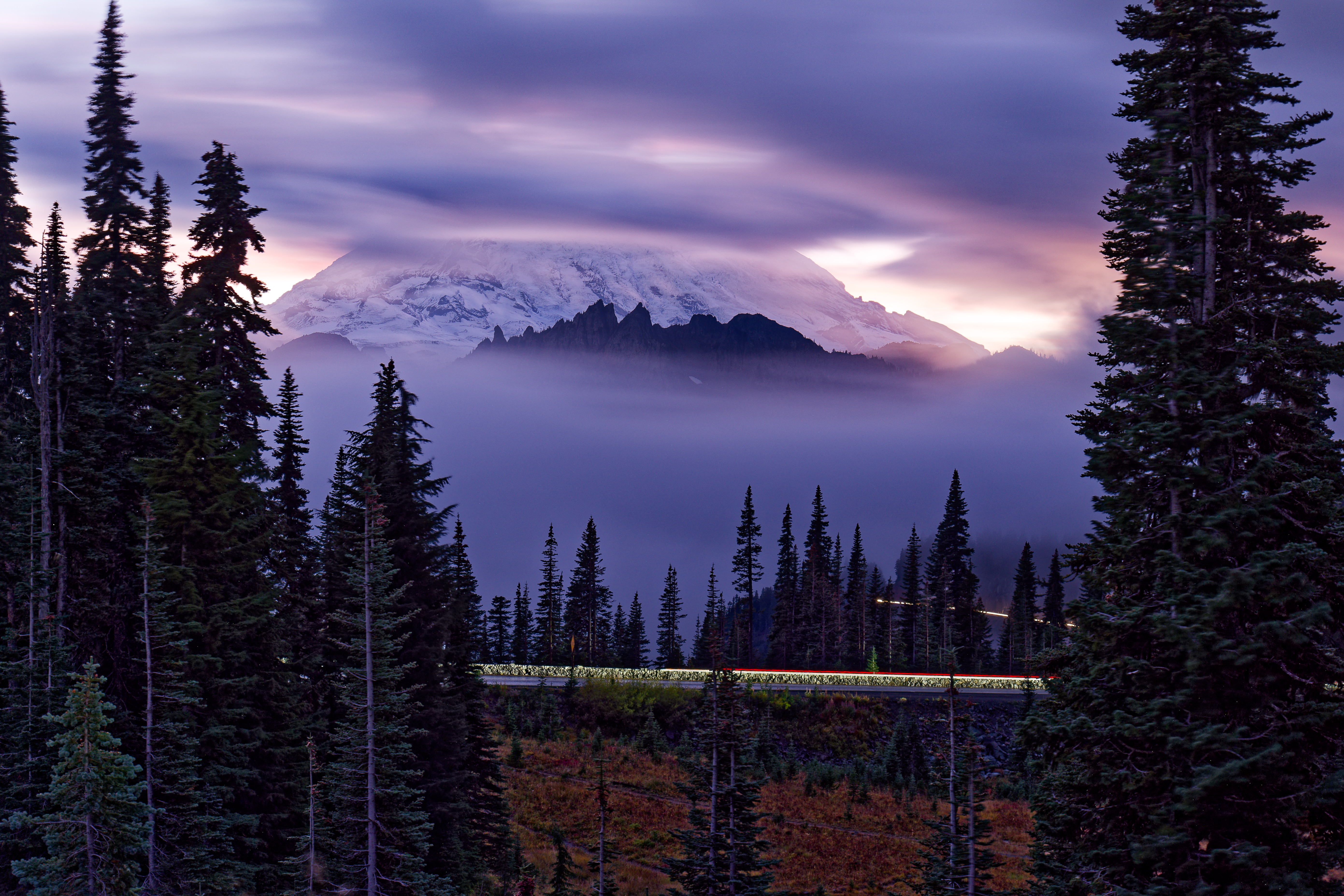 After many hours of walking around the Paradise region I drove to Tipsoo hoping the mountain would make an appearance at sunset. It made a partial appearance at least.