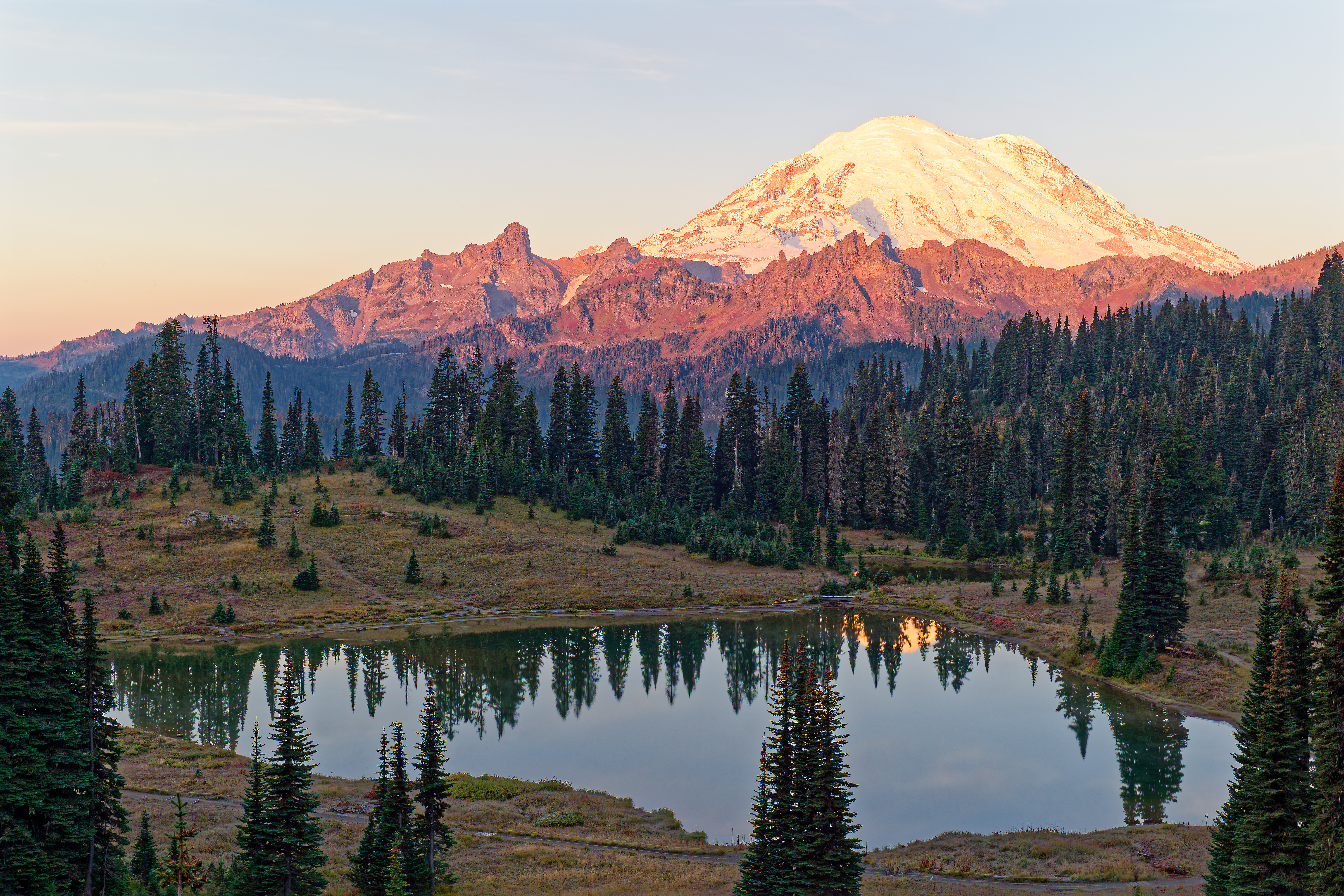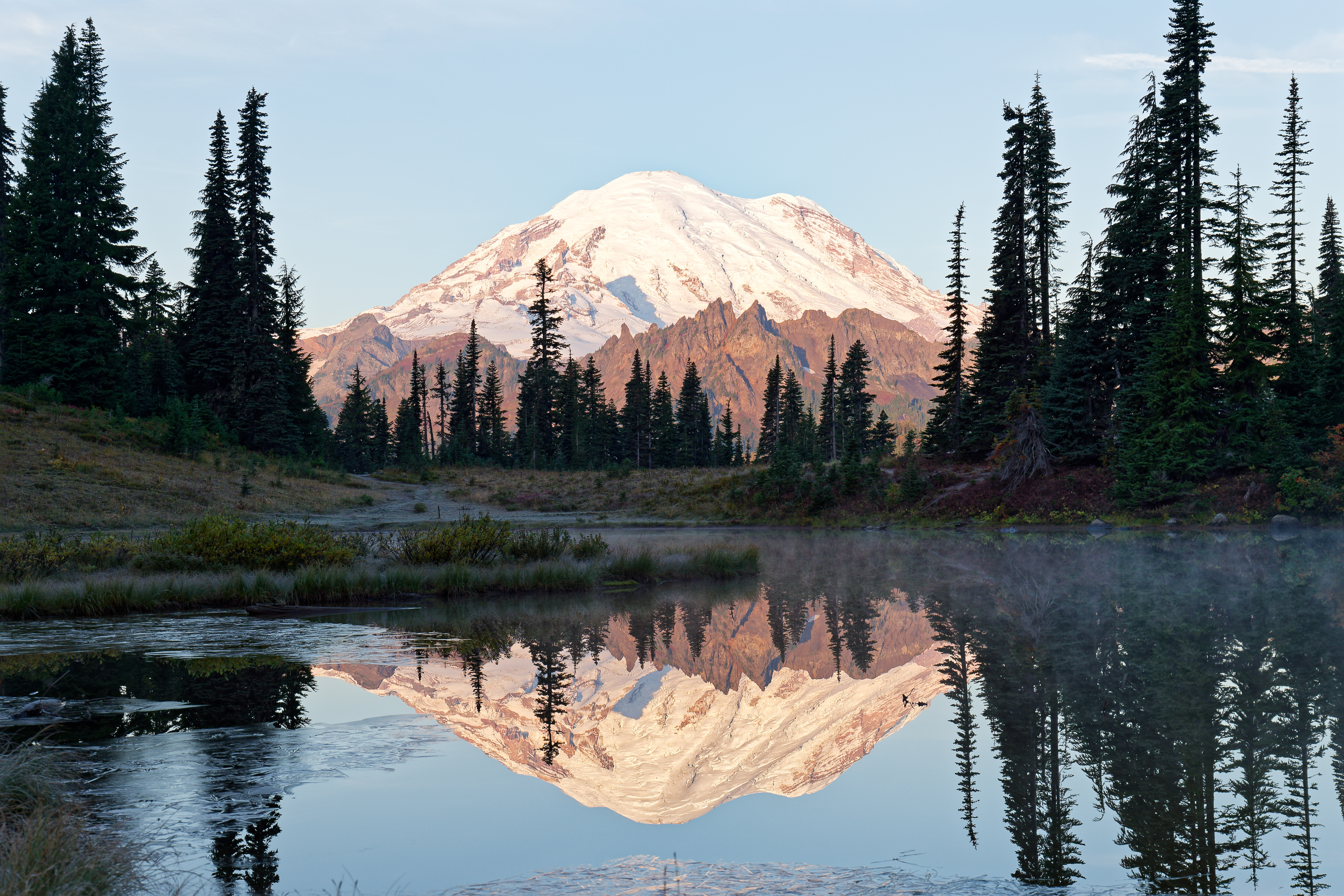 Above: Rainier and Tipsoo with some pink clouds. Above: Morning light beginning to hit Rainier Above: Rainier and surrounding sub peaks bathed in the morning sun. Above: Rainier perfectly reflected in Upper Tipsoo. Above: Rainier and Upper Tipsoo. Above: Frost tipped fall foliage above Upper Tipsoo.