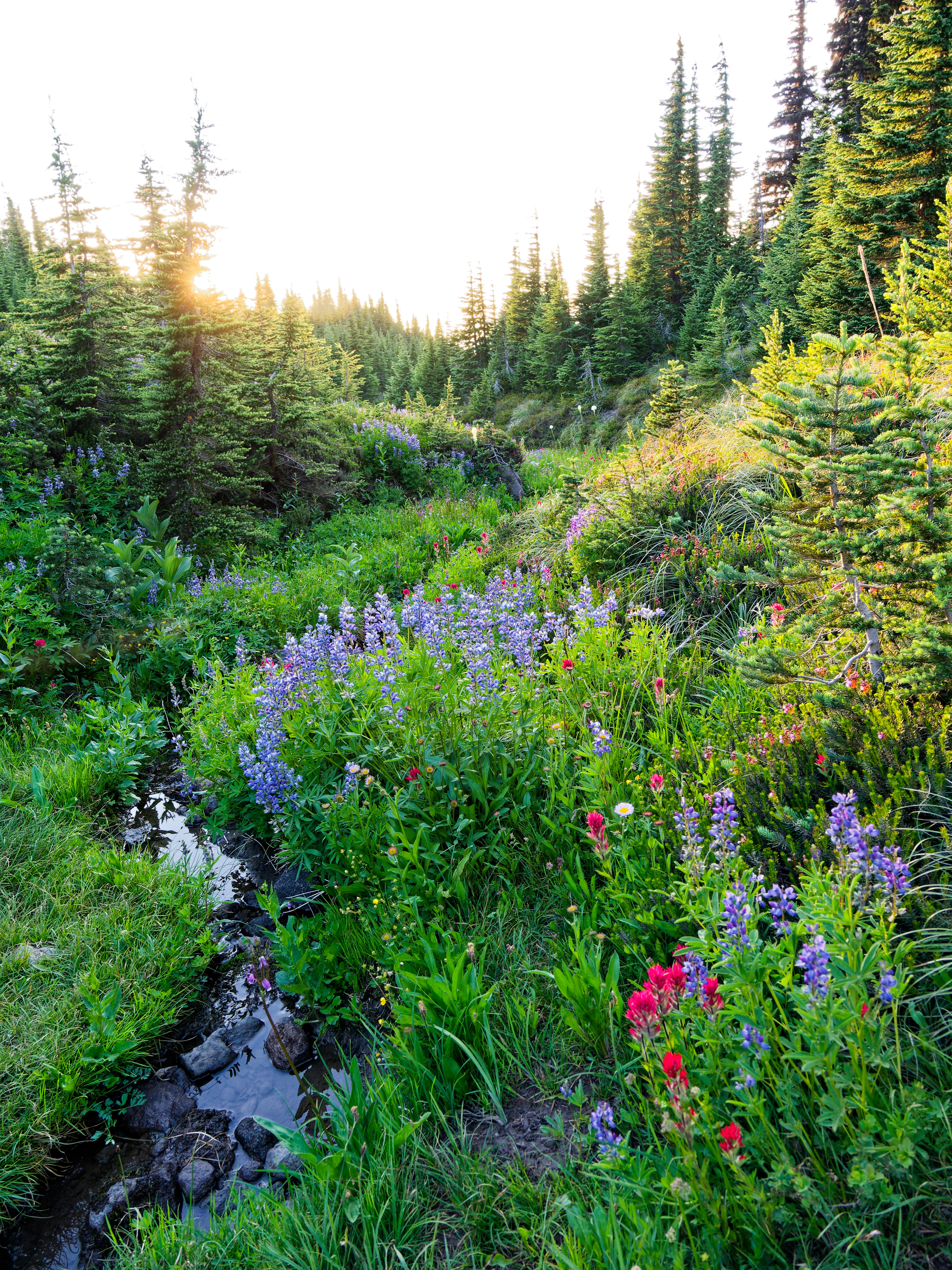 Above: Wildflowers lining a stream flowing down the slopes of Mount Hood.