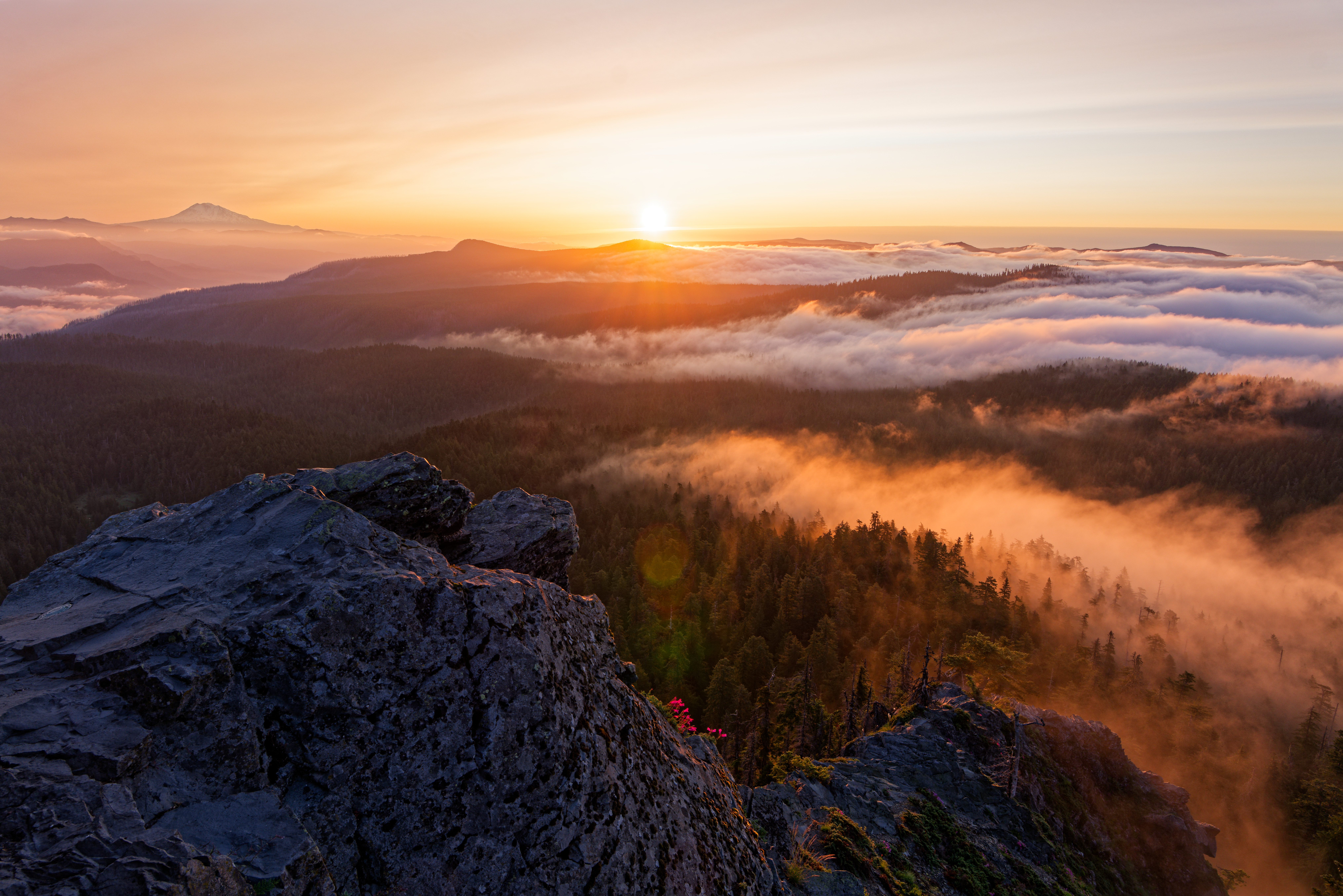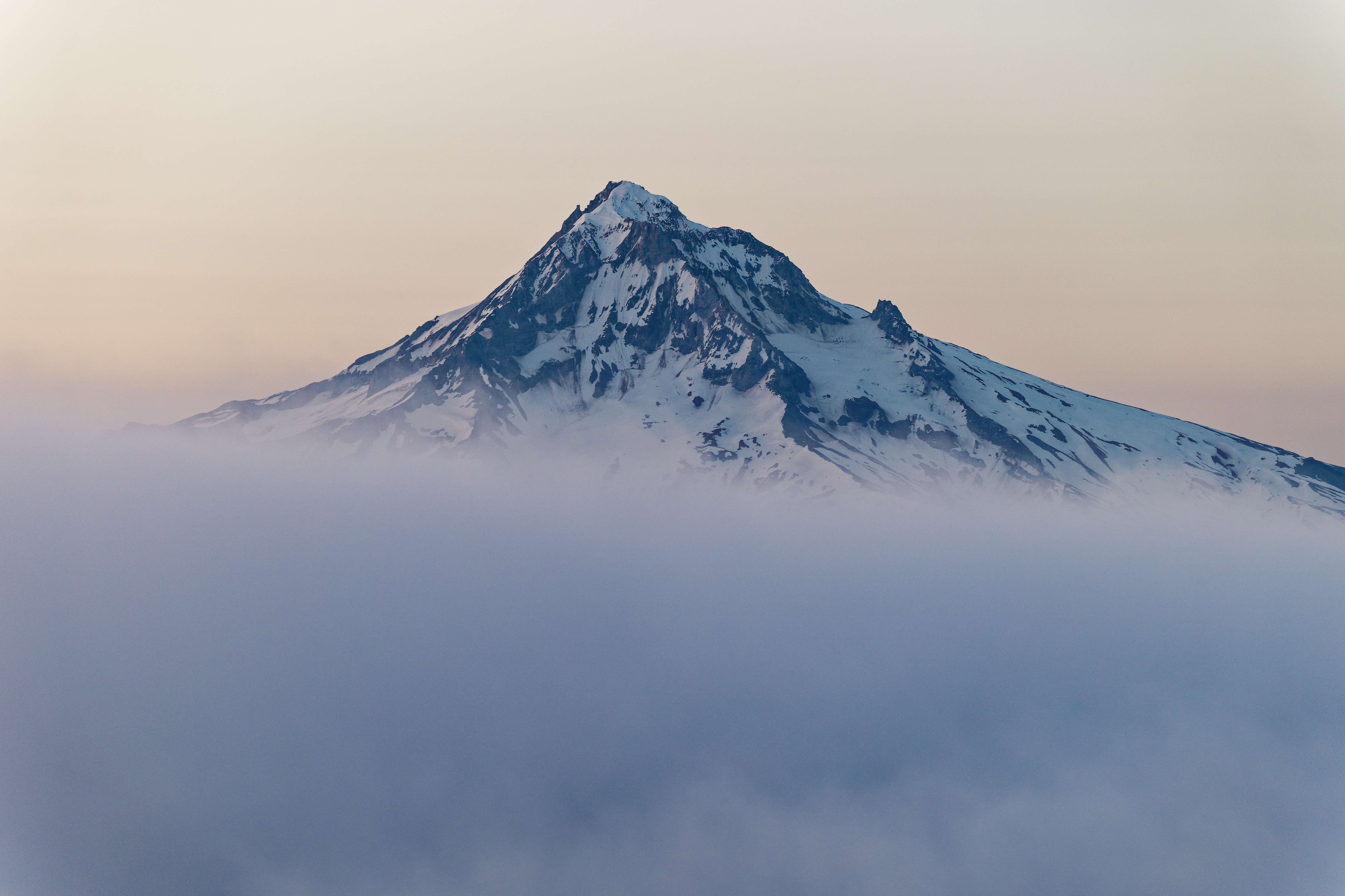 Above: Foothills of Mount Hood shrouded in fog catching the sunrise light.