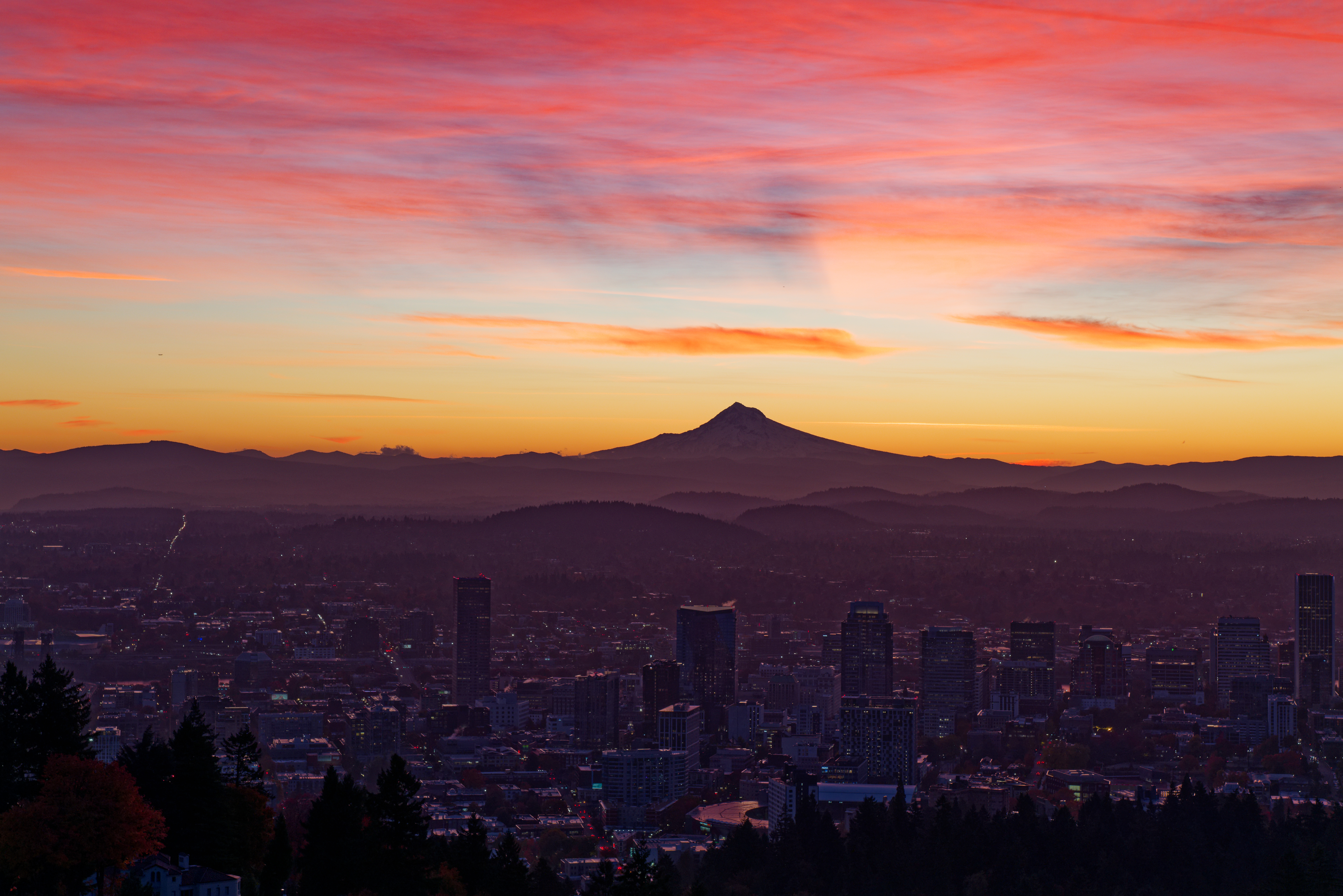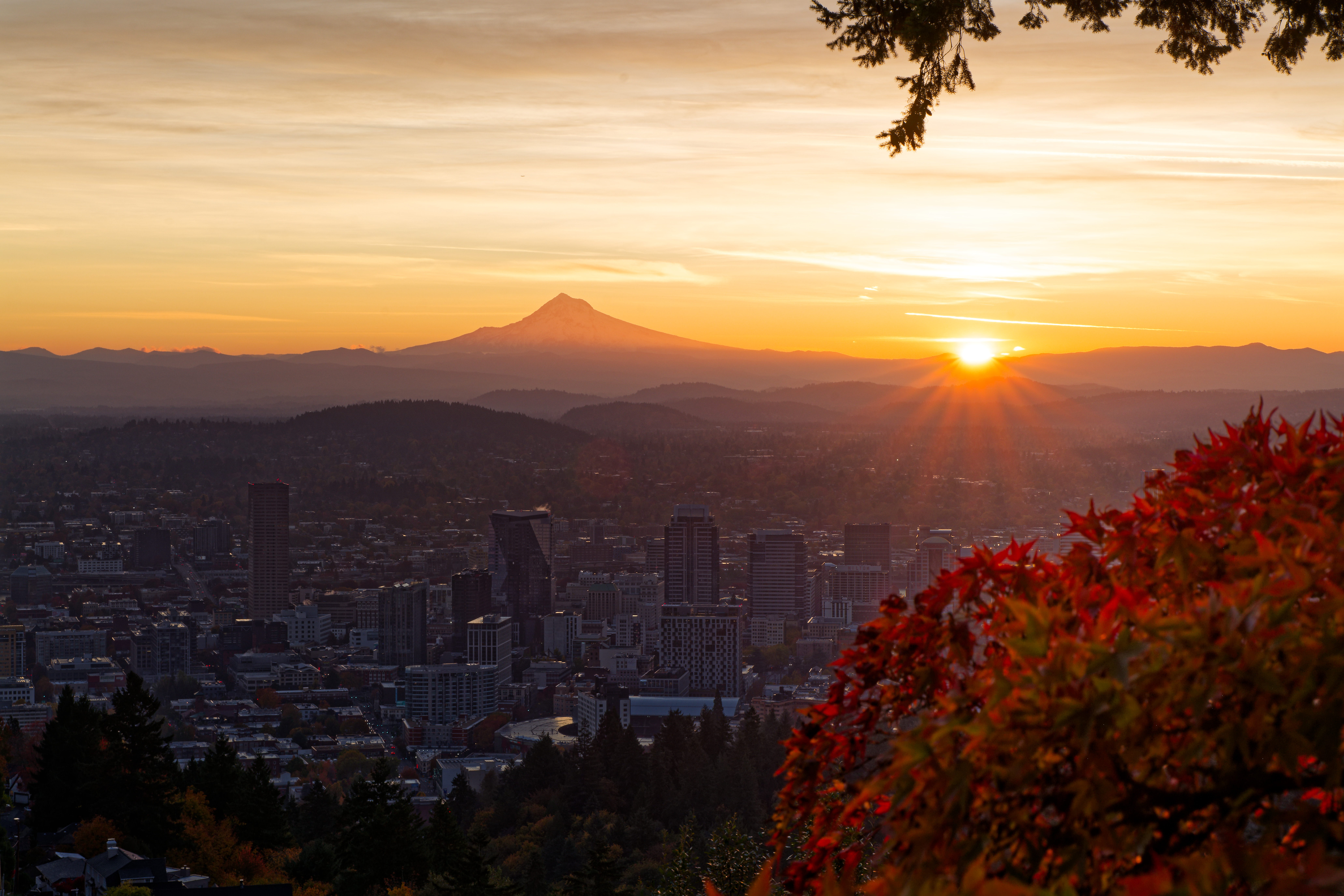 Above: Portland framed by the leaves of a maple tree and bathed in golden light.